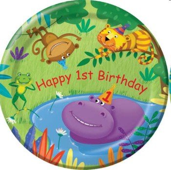 From the Jungle Buddies Party Supply Collection Jungle Buddies 1st Birthday Lunch Plates 8 Pack These lunch plates feature a group of jungle animals wearing party hats in and around a pool in the jungle Plates read Happy 1st Birthday Each pack includes 8 paper plates that measure 9 across Ju Read More..
